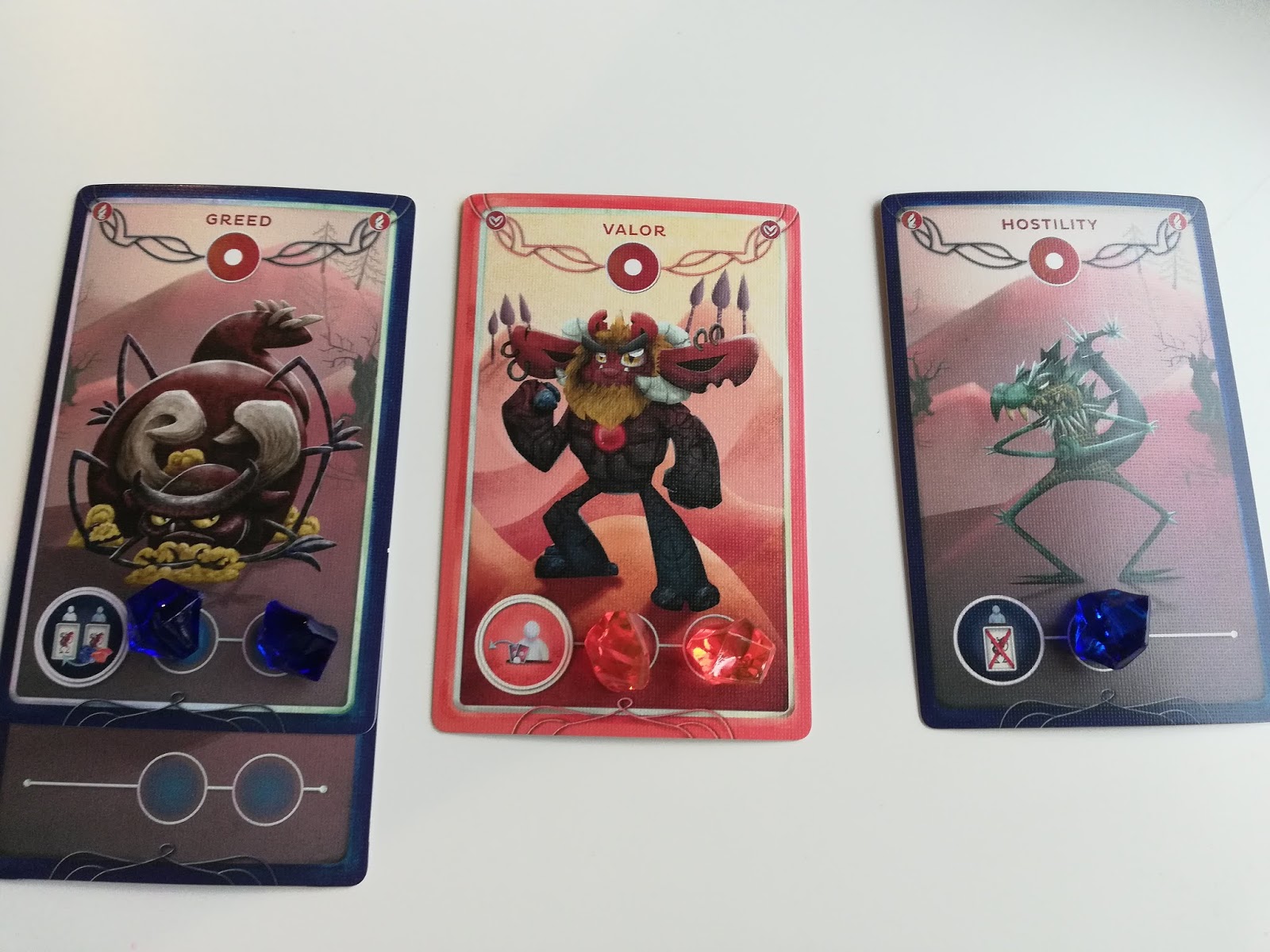 Back to the Bleakness and Brightness cards. These can be merged with emotions of the same affiliation. The Bleakness or Brightness card is placed underneath the other card with the two slots showing, giving the emotion three or four slots. The bonus in doing this is when actions are taken and the fragments spent, these would ordinarily be returned to the supply, but instead these are absorbed and moved onto the absorb slots meaning they are not lost for end or round scoring.