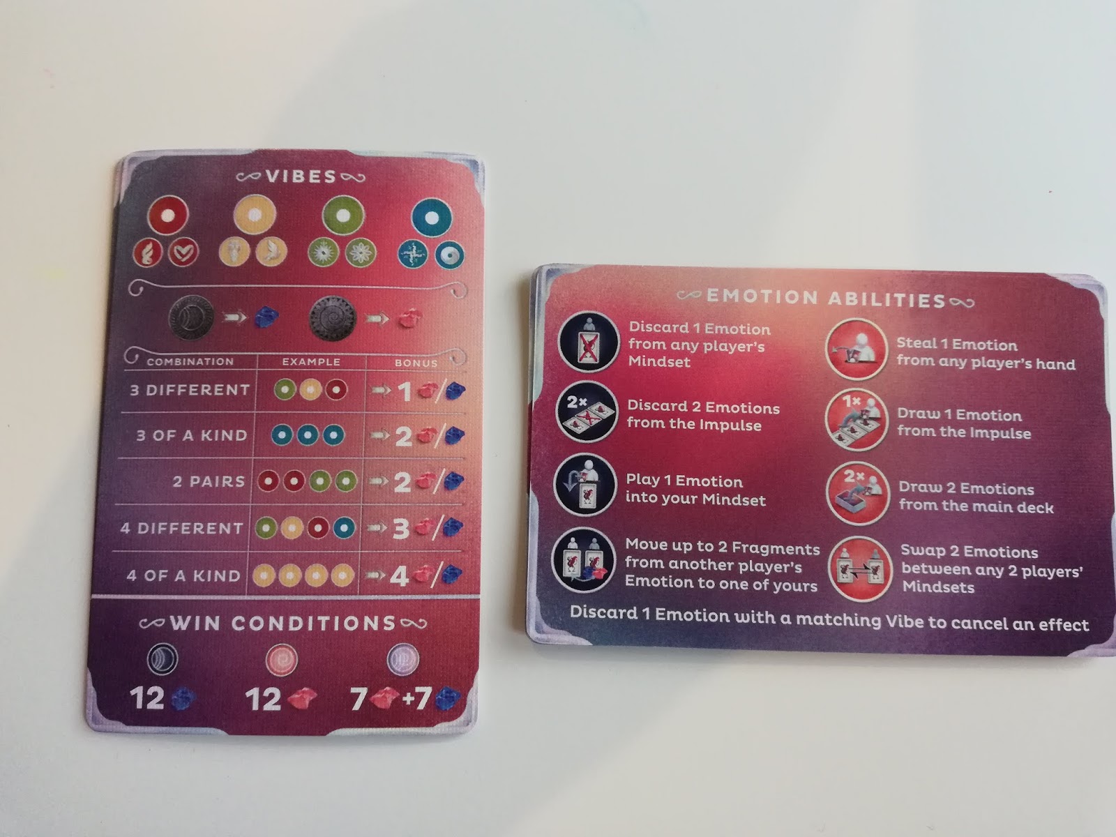 When any Impulse cannot be refilled from the corresponding Impulse Stack a Revelation occurs and the round ends. Identity fragments are awarded for certain conditions being met like Three of a Kind, Two Pairs etc. with the Vibes that are on each card being what that you have to match. The very nice metal coin also comes into play at this point. It has a face to represent either Bliss or Gloom and whichever face is showing is the type of Identity fragment you will receive when scoring at the end of the round.