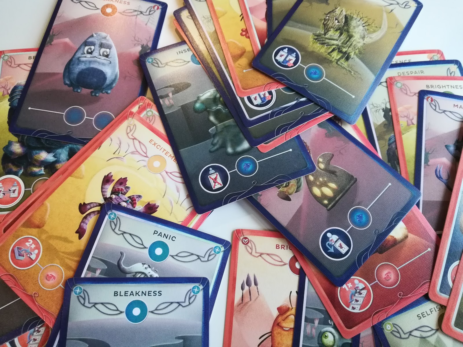 The Mindset must not exceed four cards, but there is the option to discard a card if you wish to play a different emotion. There are also cards called Bleakness and Brightness which do not have abilities or actions available on them but they do have absorb slots. This is a really good feature of the game which will hopefully become clear when I describe some of the actions that are available on the emotion cards.