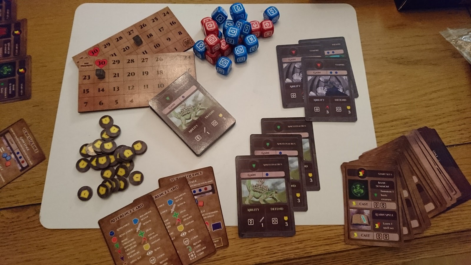 For those who weren’t round to see the decimation, you should be aware of a couple of things before you read on, the first being that I had Eoin on the podcast in the last month, and that we got on very well, and that when I know that Dice Summoners was going to be at Tabletop Scotland, it went on my list as something that I need to do. So in the interests of non collusion and complete transparency, I played the game with the knowledge that I liked these folks from Decking Awesome Games. You can then run off into the conspiracy theory side of your mind, but at the end of the day, I want them to succeed at their campaign because they were nice people and so I sat at the table for the first time hoping and wishing that I wasn’t going to have to fake smile at the end of the experience. The short story is that I took away a preview copy of the game to try to get over some internal questions that I had.