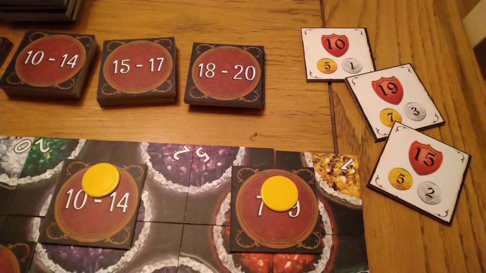I do like the scoring, which is based around the smaller contract tiles. On one side contains the range of Geode points it refers to, while on the other side has a specific number. If your Geode total is the same as the number, then you score the gold number of points, if it isn’t then you score the silver, lower number. It means that even when you feel there might be a clear winner, then fate can maybe play a tricky hand, allowing someone to snatch defeat from the jaws of victory. It’s clever and I don’t recall seeing it anywhere else.