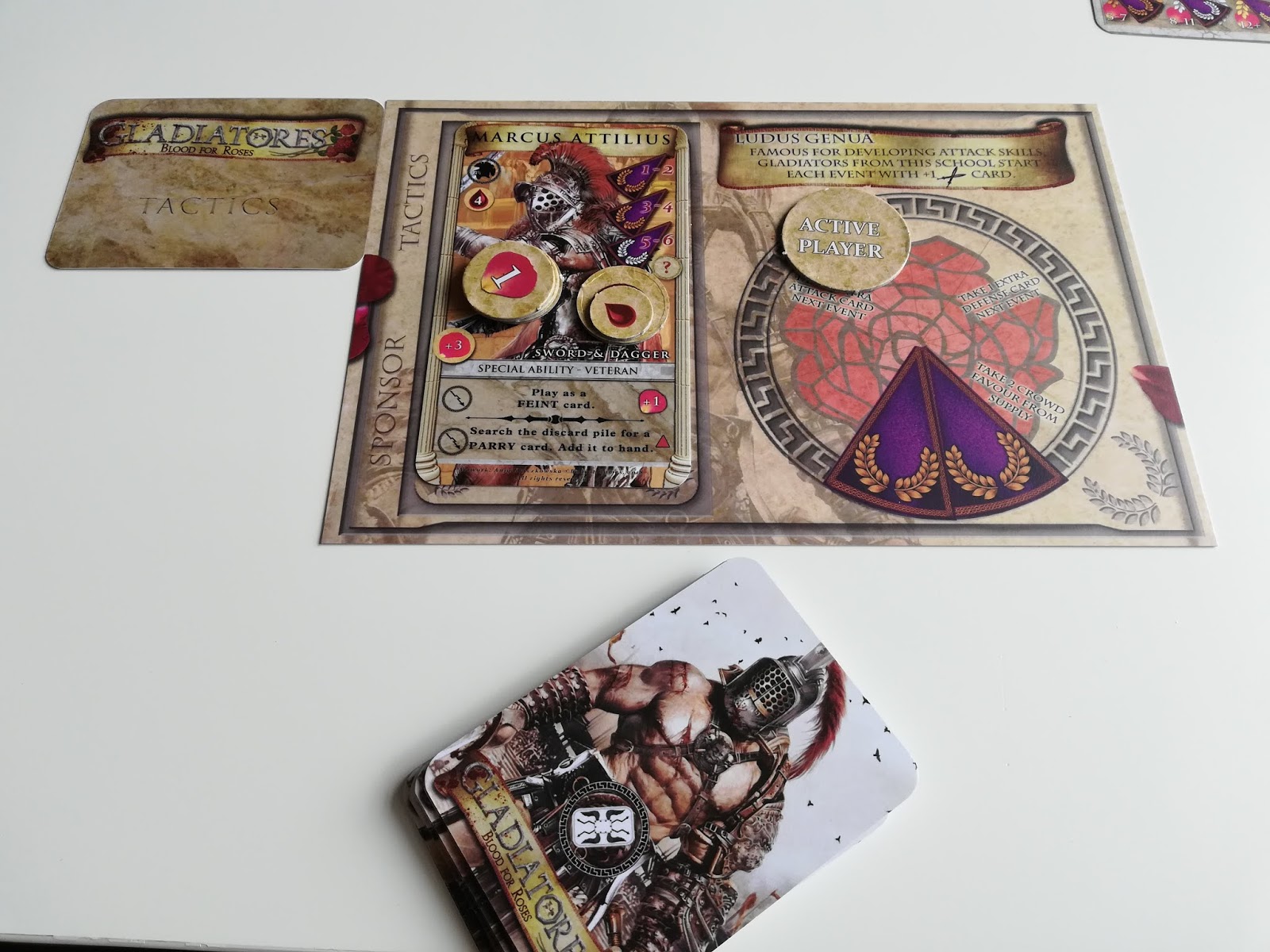 Gladiatores: Blood For Roses is a tactical combat game for 2-5 players, pitting combatants against each other in the arena. The goal is to win favour during the event and be the last gladiator standing to win the most acclaim.