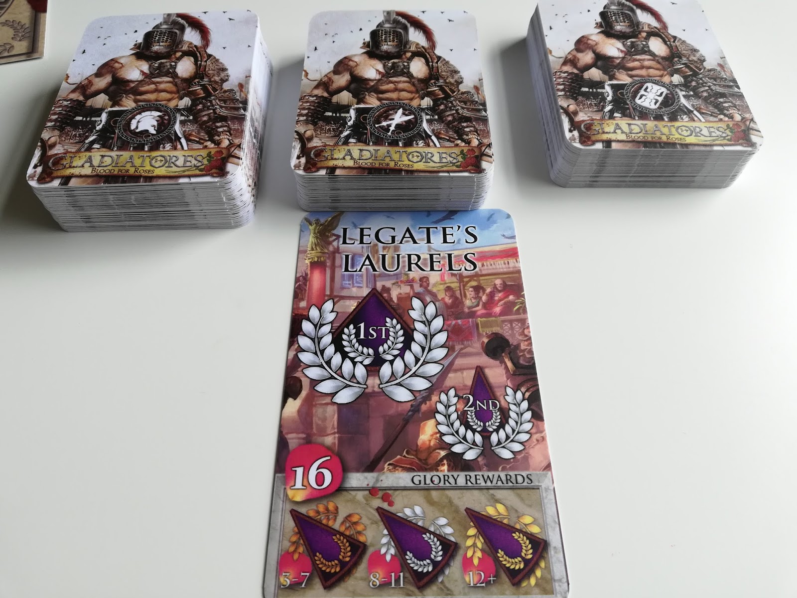 The game adds a lot more than just the combat however. There’s also an auction element, with players able to bid on gladiators to fight for their Ludus. Tactics cards and Sponsor cards can also be added to give some more options to the game. There are several events players can fight in with varying rewards. The winners of each event gain varying amounts of glory which are then placed upon the player board as wreath tokens with bonuses being unlocked as the game progresses across multiple events.