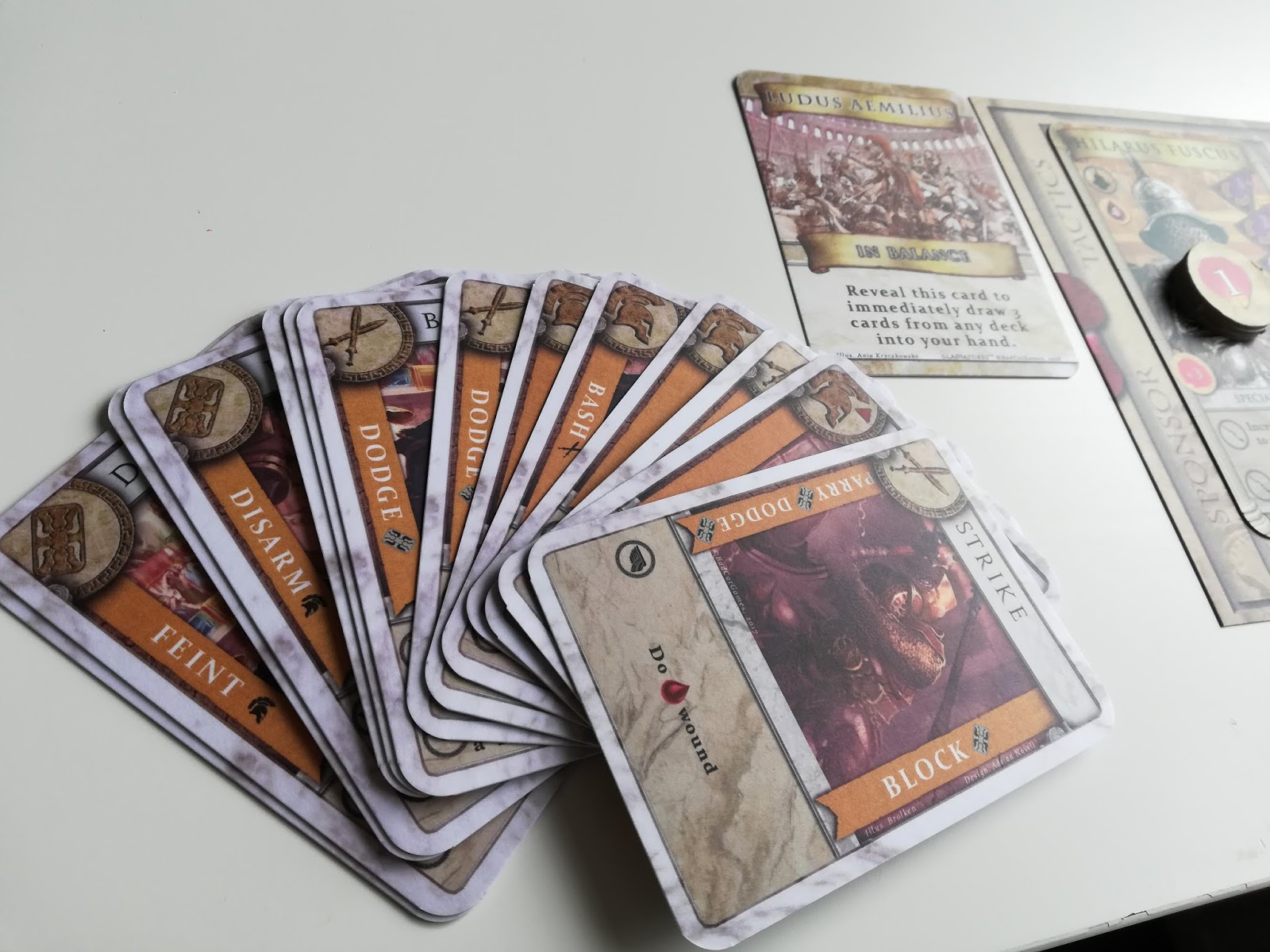 When playing at higher player counts there may be a concern that the down time for non-combatants may take these players out of the experience but I’ve found this is not the case. The battles can rage across the arena with players being targeted by consecutive players if they appear weak or tired. As I mentioned earlier the hand of cards is your stamina. Each gladiator starts with 9 cards for the gladiator they are playing and another 5 cards taken in any combination from the three decks.