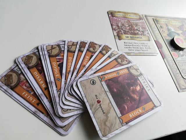 Each attack card will list the card requirements from the defending gladiator which would enable them to defend the attack. These cards have the potential to be followed up by an effect card which would swing the fight in favour of the defender, turning them into the attacking player. This gives combat a real ebb and flow. The ultimate aim in the combat is to play the final card, which triggers the cards effect. This can be inflict two wounds, inflict one wound etc. Inflicting wounds also gains the victor if the battle favour from the audience in the form of rose petals taken from the event pool.