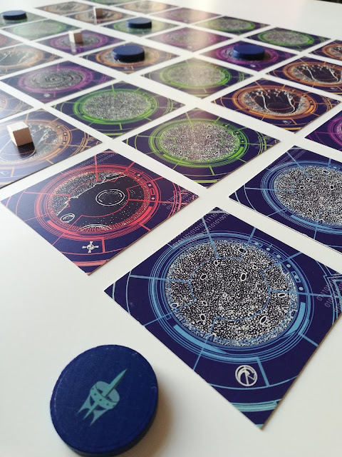 Play is conducted by setting out a grid of 7 rows and 5 columns, all face down. The first two cards in the bottom left section of the grid are always the same and give you a gentle start which served to lull me into a false sense of security immediately given there was nothing nasty lurking, as these cards do not get flipped and resolved when your ship enters the sector. Various sectors will have tokens on them and these will either represent a rock, or the sought after virus. The ticket home.