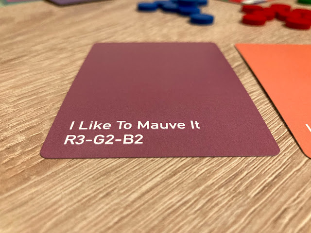 The premise is actually very simple, there are a number of colour swatches that need to be created by combining Red, Green and Blue in various quantities, and those colours in turn are created by mixing quantities of Yellow, Magenta and Cyan. Yeah. You read that right, Minerva decide to hit us with some proper colour theory, and the real primary colours are there on the table to be used instead of the blatant lies you were told about when you were a kid. The swatches have such interesting names as “Bubblegum Charlie”, “Nothing Rhymes With” and “Cactus Jack” with some frankly lovely looking colours on the back of each card, and as you play, you flip the cards open on completion, to give your space a delightful palette in front of you as you go.