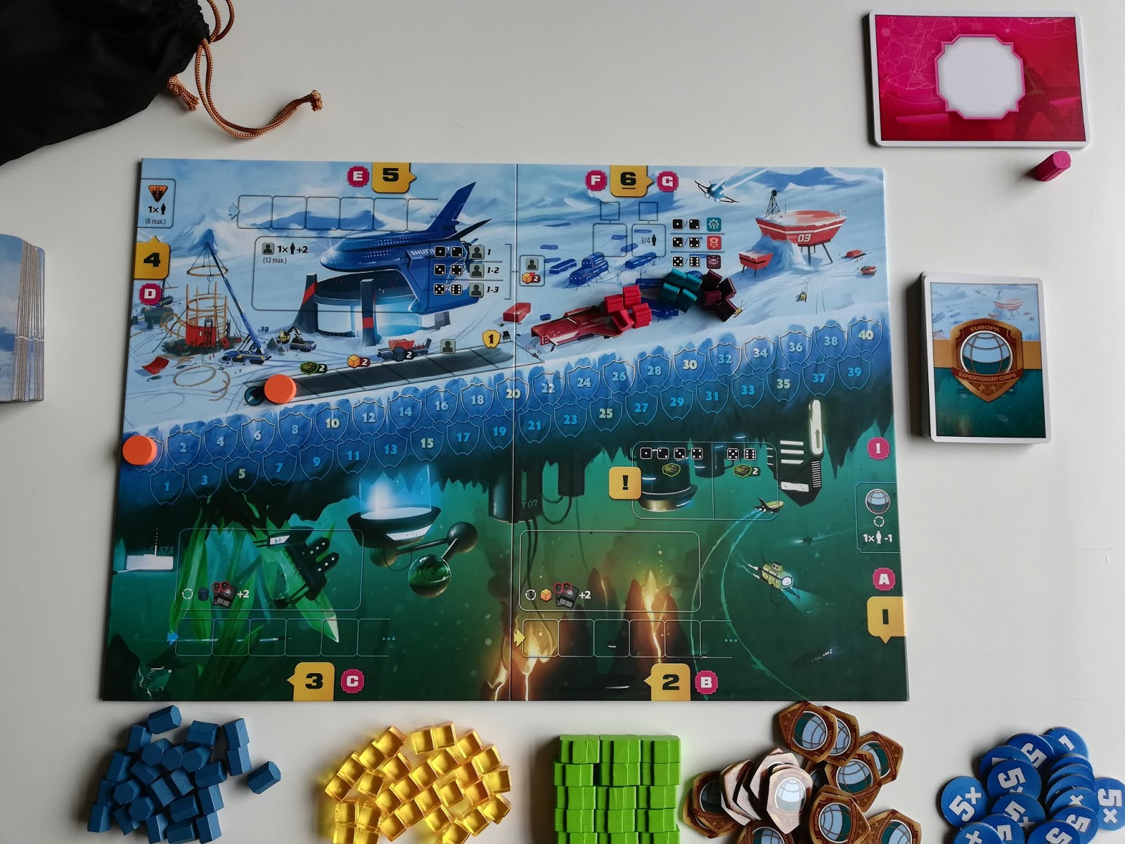Before the box is even open there’s a level of anticipation based purely on the box art. It’s very nice and nails the theme perfectly. Inside and it’s not too shabby either. The 4 classes of colonists all have a unique meeple shape and colour, making it easy to identify them. The minerals, energy and toolkit components are good, if not spectacular. There are also building tiles, coming in two flavours, Ocean and Surface, a deck of Expedition cards and a deck of Event cards. Completing the lineup are some expedition badges, event and phase markers. Each player also gets a set of dice and player markers, as well as a player mat for storing colonists, resources and expedition badges earned.