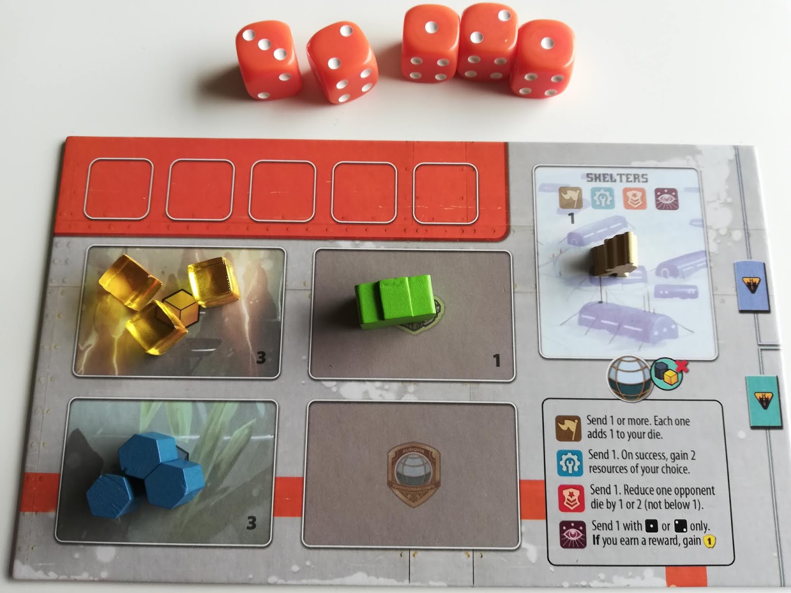 There are some nice touches in the game. Expeditions require the total of the dice committed to the space to match or better the value on the card. Some cards come with multiple rewards, from victory points to colonists to buildings, so I found myself drawn to that a lot. The player with the highest value die (in the event of a tie, the person who commits to the expedition first wins) gets to claim the spoils offered by the card and also gets an expedition badge which will mean victory points at tie end of the game. Where there are multiple awards on the card, they choose which to claim and the 2nd player gets the other reward. If any other players were committed to the expedition but did not get a reward they are compensated by moving a space on the Relief Track. This is a secondary track to the main scoring one, where failed dice placement can be compensated with resources, toolkits, colonists and if the end is reach, a victory point.